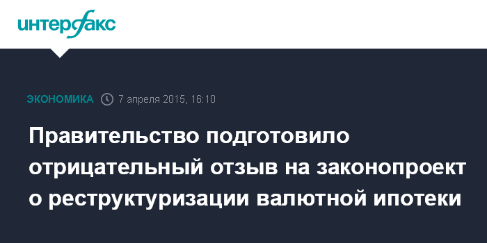Москва. 7 апреля. INTERFAX.RU – Правительство подготовило отрицательное заключение на законопроект о реструктуризации в рубли ипотечных кредитов, оформленных в валюте, сообщил глава комитета Госдумы по финансовому рынку Николай Гончар на заседании комитета во вторник.
