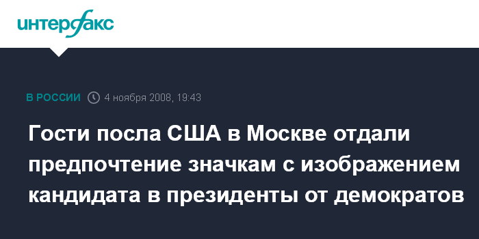 Прием в резиденции посла по случаю выборов проводится уже во второй раз. Первый такой вечер состоялся в начале ноября 2004 года, когда за место в Белом доме вели борьбу Джордж Буш и сенатор-демократ Джон Керри. Тогда гости быстрее разобрали значки с изображением и надписью Дж. Буш.