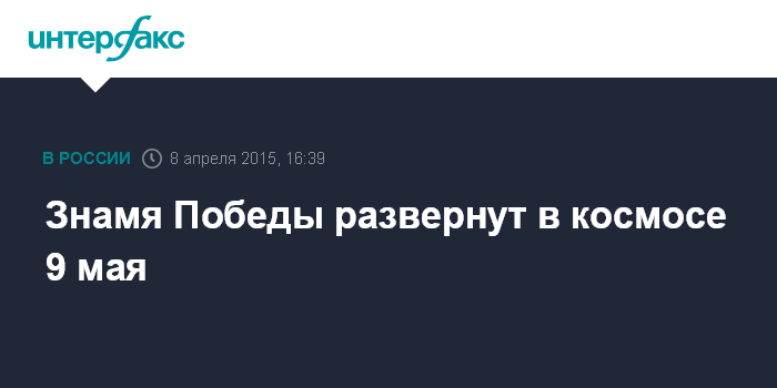Москва. 8 апреля. INTERFAX.RU - Копия красного знамени, которое было водружено над зданием Рейхстага, отправится на Международную космическую станцию (МКС) 28 апреля и будет развернуто в космосе 9 мая в честь 70-летнего юбилея Великой Победы. На орбиту символ Победы над фашизмом доставят на грузовом корабле "Прогресс М-27М" с космодрома Байконур, сообщает корреспондент "Интерфакса" с торжественной церемонии передачи знамени в пресс-центре Звездного городка (Московская область) в среду.