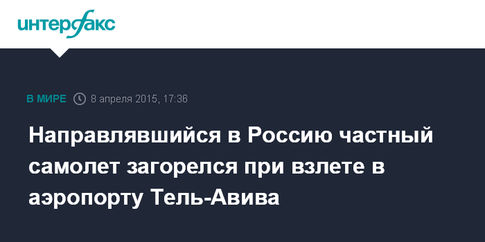 Москва. 8 апреля. INTERFAX.RU - Частный самолет, который должен был вылететь в Россию, загорелся во время взлета в международном аэропорту Тель-Авива "Бен-Гурион", сообщает в среду Haarez.