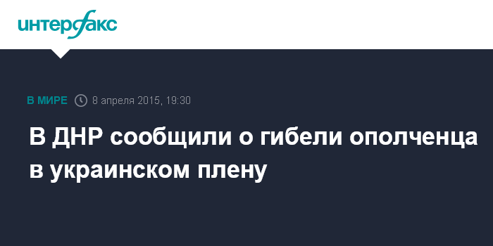 Москва. 8 апреля. INTERFAX.RU - В самопровозглашенной Донецкой народной республике сообщили о гибели взятого в плен украинскими военными ополченца.
