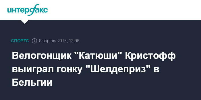 Москва. 8 апреля. INTERFAX.RU - Норвежский гонщик Александр Кристофф, выступающий за российскую велокоманду "Катюша", стал победителем гонки "Шелдеприз" в Бельгии.