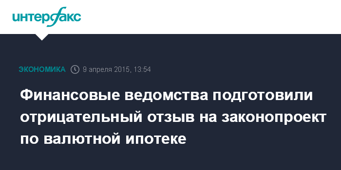Москва. 9 апреля. INTERFAX.RU – Минэкономразвития подготовило отрицательный отзыв на законопроект депутатов Госдумы о реструктуризации валютной ипотеки, сообщил "Интерфаксу" источник в финансово-экономическом блоке правительства. Минфин, Минстрой и ЦБ РФ поддержали отрицательный отзыв министерства.