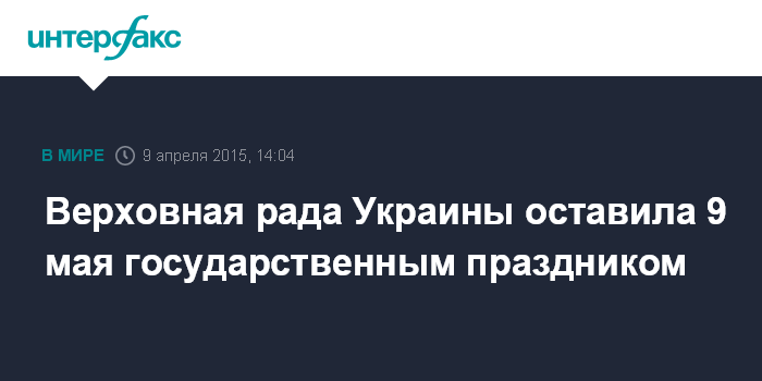 Москва. 9 апреля. INTERFAX.RU - Верховная рада приняла правительственные законодательные инициативы, согласно которым 8 мая на Украине становится Днем памяти и примирения в честь всех жертв Второй мировой войны. 9 мая остается Днем победы над нацизмом во Второй мировой войне.