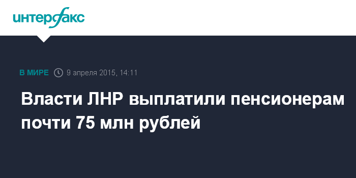 Москва. 9 апреля. INTERFAX.RU - Более 74 миллионов рублей выплатили почти 20 тысячам пенсионерам в самопровозглашенной Луганской народной республике.