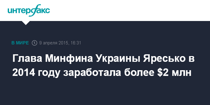 Москва. 9 апреля. INTERFAX.RU - Доходы министра финансов Украины Наталии Яресько в 2014 году составили около $2,05 млн, или 22,814 млн грн, говорится в декларации министра, обнародованной на сайте ведомства.