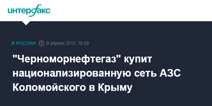 Москва. 9 апреля. INTERFAX.RU - Государственная крымская компания "Черноморнефтегаз" намерена выкупить переданную ей в управление сеть АЗС, национализированную руководством республики у украинского бизнеса Игоря Коломойского, сообщил генеральный директор "Черноморнефтегаза" Сергей Бейм.