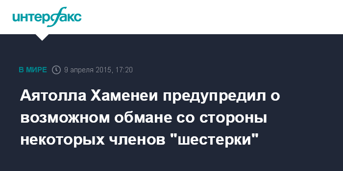 Москва. 9 апреля. INTERFAX.RU - Верховный лидер Ирана аятолла Али Хаменеи заявил в четверг, что доверяет иранским переговорщикам по атомной проблеме, но опасается обмана со стороны некоторых представителей "шестерки" международных посредников.