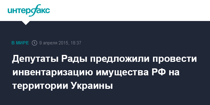 Москва. 9 апреля. INTERFAX.RU - Народные депутаты из фракции "Народный фронт" предлагают Верховной раде обратиться в кабинет министров относительно проведения инвентаризации расположенного на Украине имущества, принадлежащего на праве собственности Российской Федерации и ее резидентам.