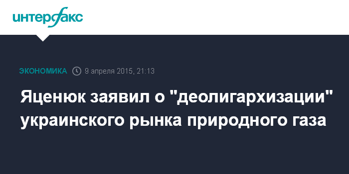Москва. 9 апреля. INTERFAX.RU - Премьер-министр Украины Арсений Яценюк поприветствовал принятие Верховной радой правительственного законопроекта о рынке природного газа, который лишит олигархов права бесплатно пользоваться государственными газораспределительными сетями.