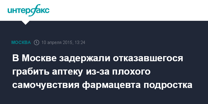Москва. 10 апреля. INTERFAX.RU - Вор, отказавшийся грабить аптеку из-за того, что фармацевту стало плохо, оказался подростком, сообщил "Интерфаксу" в пятницу источник в правоохранительных органах.