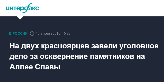 Москва. 10 апреля. INTERFAX.RU - Главное следственное управление СКР по Красноярскому краю возбудило уголовное дело в отношении двух жителей Красноярска, подозреваемых в осквернении 7 скульптур на "Аллее Славы", посвященных Великой Отечественной войне, сообщает пресс-служба ведомства.