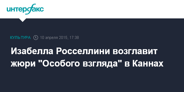 Москва. 10 апреля. INTERFAX.RU - Итало-американская актриса Изабелла Росселлини возглавит жюри второй по значимости программы Каннского кинофестиваля "Особый взгляд", сообщается на сайте киносмотра.
