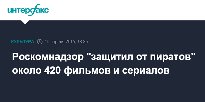 Москва. 10 апреля. INTERFAX.RU - За время действия "антипиратского" закона Роскомнадзор ограничил доступ в интернете более чем к 400 фильмам и сериалам, сообщается на сайте организации.