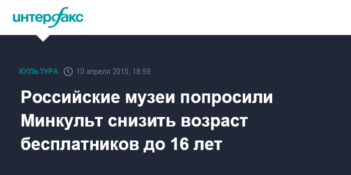 Москва. 10 апреля. INTERFAX.RU - Российские музейщики просят министерство культуры РФ снизить возрастной ценз для бесплатных посетителей с 18 до 16 лет, сообщил президент Союза музеев России, генеральный директор Эрмитажа Михаил Пиотровский на пресс-конференции в Великом Новгороде, где проходит выездное заседание президиума Союза музеев.