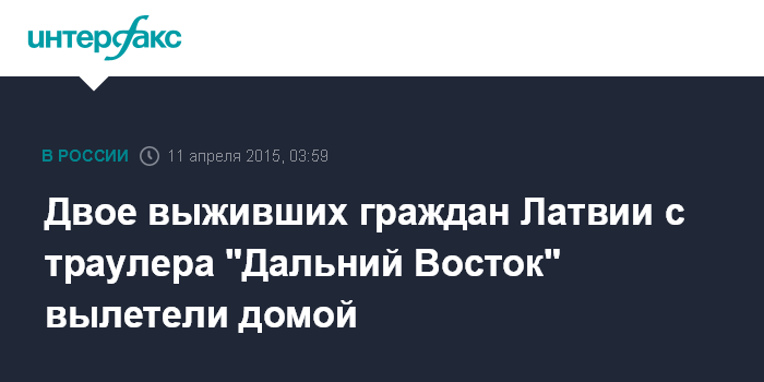 Москва. 11 апреля. INTERFAX.RU - Двое спасенных граждан Латвии с траулера "Дальний Восток" вылетели утром в субботу из Южно-Сахалинска рейсовым самолетом в Москву, откуда затем отправятся в Ригу, сообщил агентству "Интерфакс" представитель МИД РФ в Южно-Сахалинске Владимир Носов.
