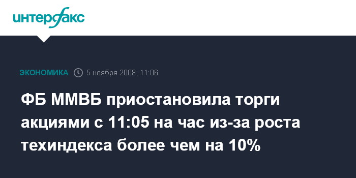 ФБ ММВБ приостановила торги акциями с 11:05 на час из-за роста техиндекса более чем на 10%
