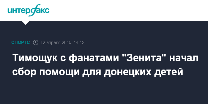 Москва. 12 апреля. INTERFAX.RU - Капитан "Зенита" Анатолий Тимощук совместно с фанатами петербургского футбольного клуба начал сбор помощи для детей из детдомов Донецка.