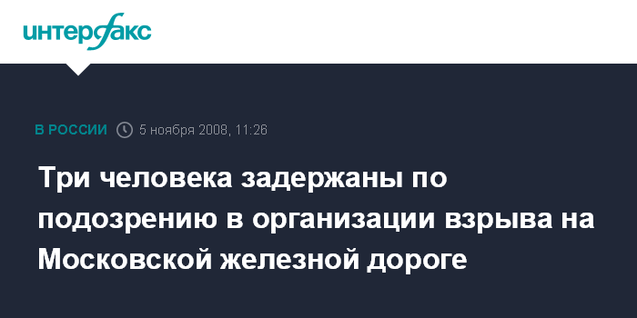 Москва. 5 ноября. INTERFAX.RU - Трое мужчин, жителей столичного региона, задержаны по подозрению в организации взрыва на Павелецком направлении Московской железной дороги, сообщил "Интерфаксу" в среду источник в правоохранительных органах столицы.