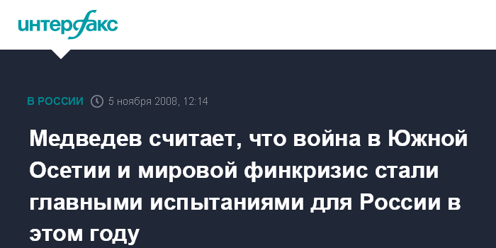 Москва. 5 ноября. INTERFAX.RU - Президент РФ Дмитрий Медведев назвал агрессию в отношении Южной Осетии и нарастающий мировой финансовый кризис двумя главными испытаниями для России в 2008 году.