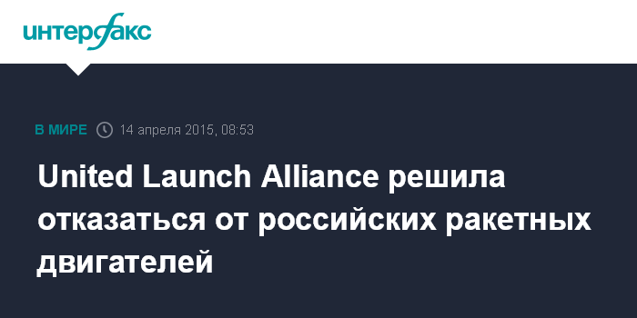 Москва. 14 апреля. INTERFAX.RU - Американская United Launch Alliance LLC, акционерами которой являются Boeing Co. и Lockheed Martin Corp., намерена к 2019 году создать новую дешевую ракету-носитель, которая позволит отказаться от использования российских двигателей РД-180 при выведении на орбиту американских военных спутников, сообщает The Financial Times.