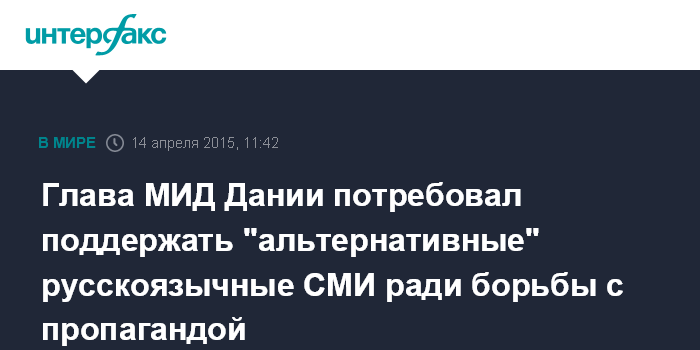Москва. 14 апреля. INTERFAX.RU - Глава МИД Дании Мартин Лидегор считает, что Евросоюз должен противопоставить "российской пропаганде" поддержкой независимых русскоязычных СМИ.