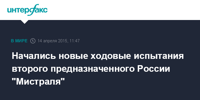 Москва. 14 апреля. INTERFAX.RU - Начался второй испытательный выход в море десантного вертолетоносного корабля-дока (ДВКД) "Севастополь" типа "Мистраль", сообщил во вторник "Интерфаксу" военно-дипломатический источник.
