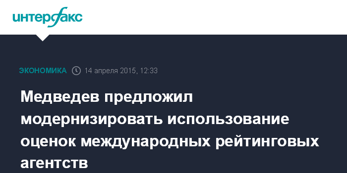 Москва. 14 апреля. INTERFAX.RU – Премьер-министр РФ Дмитрий Медведев считает, что ряд прогнозов рейтинговых агентств в отношении перспектив российской экономики является поводом задуматься над модернизацией использования их оценок.