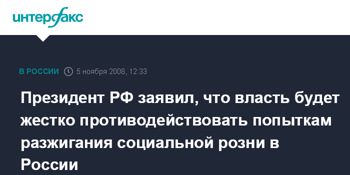 "Считаю своим долгом предостеречь тех, кто надеется спровоцировать обострение политической обстановки. Мы не позволим разжигать социальную и межнациональную рознь, обманывать людей и вовлекать их в противоправные действия", - сказал Д.Медведев в ежегодном Послании Федеральному Собранию РФ.