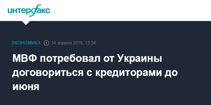 Москва. 14 апреля. INTERFAX.RU – Украине и ее кредиторам необходимо достичь соглашения до июня, говорится в сообщении МВФ со ссылкой на первого заместителя директора-распорядителя фонда Дэвида Липтона.