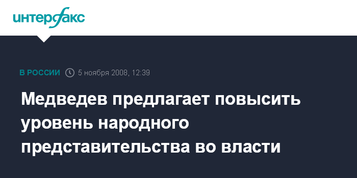 "Предлагаю принять меры по дальнейшему повышению уровня и качества народного представительства во власти, меры, способные обеспечить большую включенность граждан в политическую жизнь", - заявил Д.Медведев, выступая в среду с Посланием ФедеральномуСобранию.