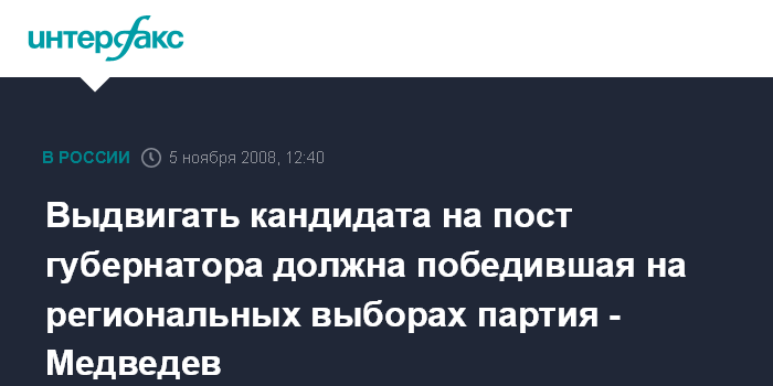 Москва. 5 ноября. INTERFAX.RU - Президент РФ Дмитрий Медведев считает, что партии, победившие на региональных выборах, должны предлагать кандидатуру руководителя субъекта РФ.