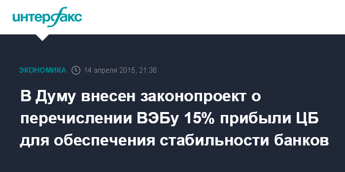 Москва. 14 апреля. INTERFAX.RU - Правительство внесло в Госдуму законопроект о перечислении Внешэкономбанку (ВЭБ) 15% прибыли Центробанка за 2014 год. Текст документа опубликован в электронной базе документов нижней палаты парламента.