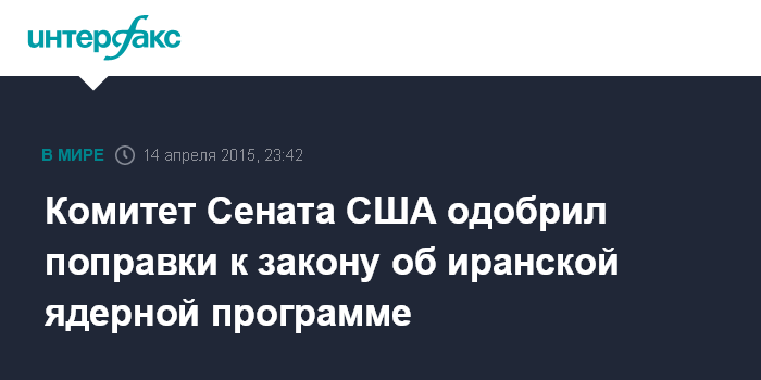 Москва. 14 апреля. INTERFAX.RU - Комитет Сената США по внешним связям единогласно одобрил законопроект, который дает Конгрессу решающий голос по вопросу иранской ядерной программы, сообщило во вторник агентство Associated Press.