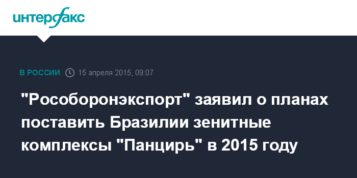 Москва. 15 апреля. INTERFAX.RU - "Рособоронэкспорт" рассчитывает подписать контракт на поставку Бразилии российских зенитных ракетно-пушечных комплексов (ЗРПК) "Панцирь-С1" в 2015 году, сообщил заместитель гендиректора компании Сергей Гореславский.