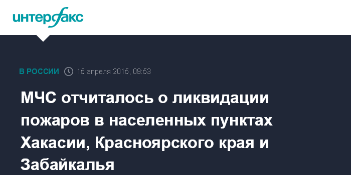 Москва. 15 апреля. INTERFAX.RU - МЧС России сообщает о ликвидации пожаров в населенных пунктах Хакасии, Красноярского края и Забайкалья.