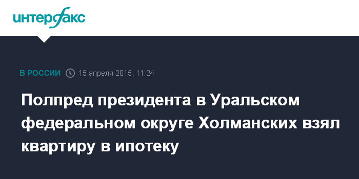 Москва. 15 апреля. INTERFAX.RU - Полпред президента РФ в Уральском федеральном округе Игорь Холманских единственный из руководящих чиновников администрации главы государства приобрел в 2014 году квартиру в ипотеку.