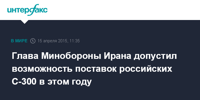 Москва. 15 апреля. INTERFAX.RU - Российские зенитные ракетные системы С-300 будут поставлены Ирану уже в 2015 году, сообщает в среду иранское агентство ИРНА со ссылкой на главу оборонного ведомства Исламской республики Хоссейна Декхана.