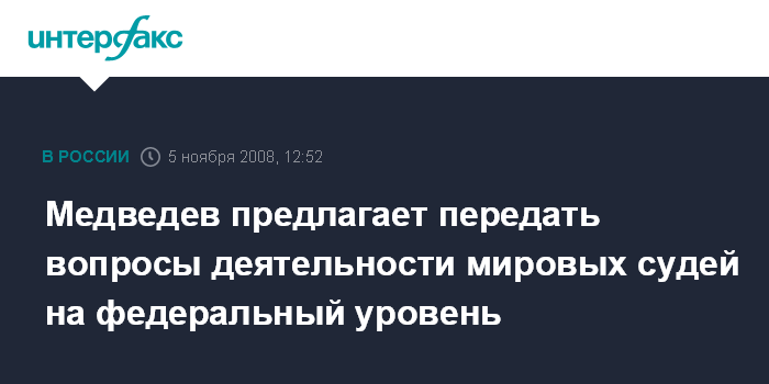 Москва. 5 ноября. INTERFAX.RU - Вопросы деятельности мировых судей должны быть переданы на федеральный уровень, заявил президент России Дмитрий Медведев.