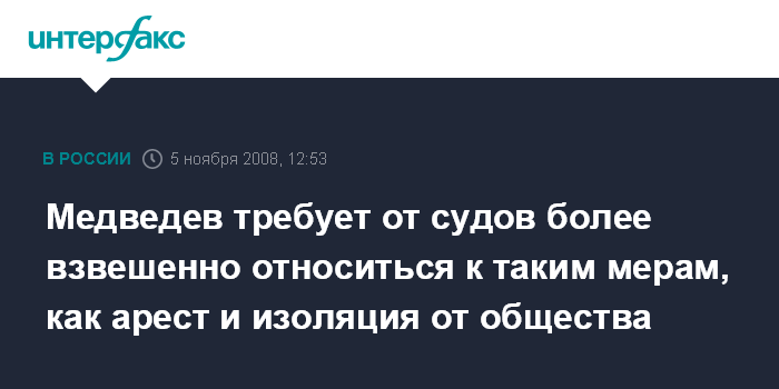 Москва. 5 ноября. INTERFAX.RU - Президент РФ Дмитрий Медведев, говоря о реформе судебной системы, призвал судей более взвешенно относиться к таким мерам, как арест и изоляция от общества.