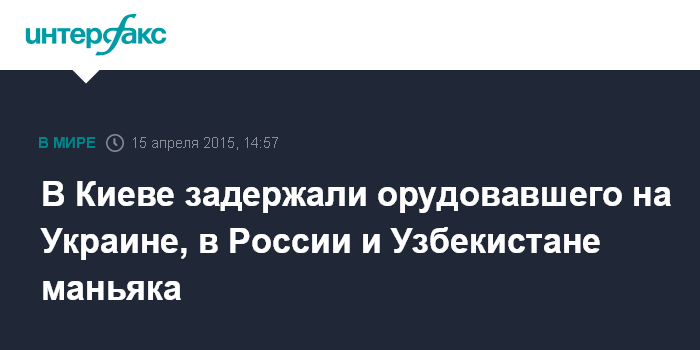 Москва. 15 апреля. INTERFAX.RU - Сотрудники киевского уголовного розыска задержали 41-летнего уроженца Узбекистана, который совершил ряд убийств, изнасилований и грабежей женщин в России, на Украине и в Узбекистане.