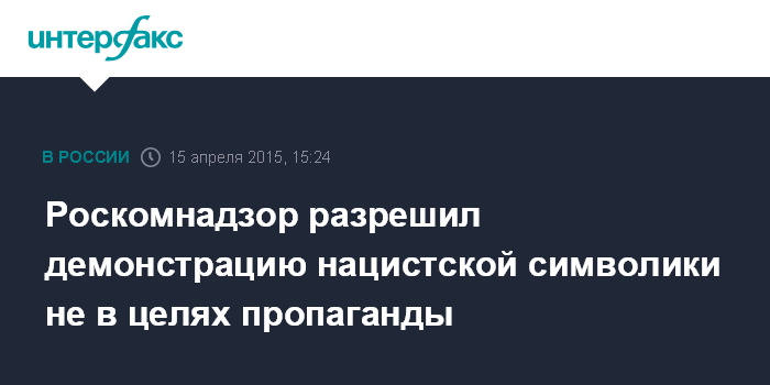 Москва. 15 апреля. INTERFAX.RU - Демонстрация нацистской символики, не нацеленная на пропаганду, не должна трактоваться как нарушение закона о противодействии экстремизму, заявили в Роскомнадзоре.