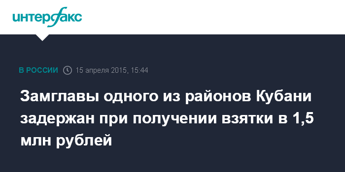 Замглавы одного из районов Кубани задержан при получении взятки в 1,5 млн рублей