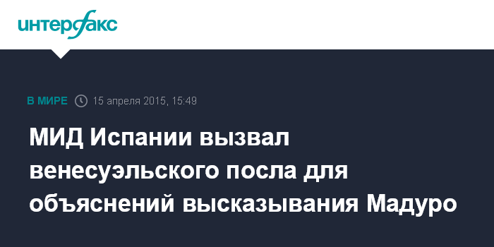 Москва. 15 апреля. INTERFAX.RU - Посол Венесуэлы в Мадриде Марио Риккардо Исеа в среду вызван в испанский МИД для объяснений в связи с высказываниями венесуэльского президента Николаса Мадуро, который ранее назвал главу правительства Испании "расистом".