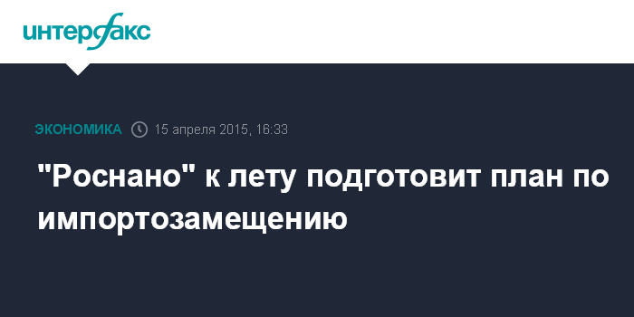 Москва. 15 апреля. INTERFAX.RU - ОАО "Роснано" к лету текущего года планирует подготовить и согласовать в правительстве РФ план мероприятий по импортозамещению, сообщили "Интерфаксу" в компании.