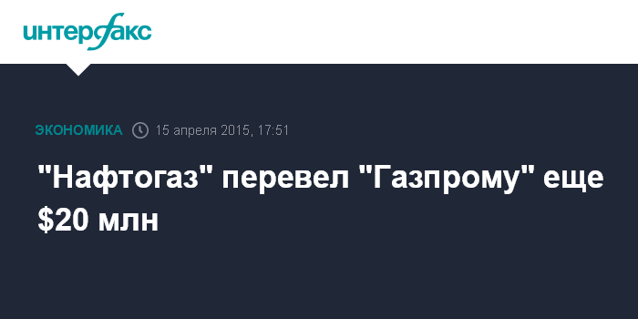Москва. 15 апреля. INTERFAX.RU – "Нафтогаз Украины" 9 апреля перечислил "Газпрому" еще $20 млн за поставки российского газа в апреле, сообщили агентству "Интерфакс" в пресс-службе госхолдинга в среду.