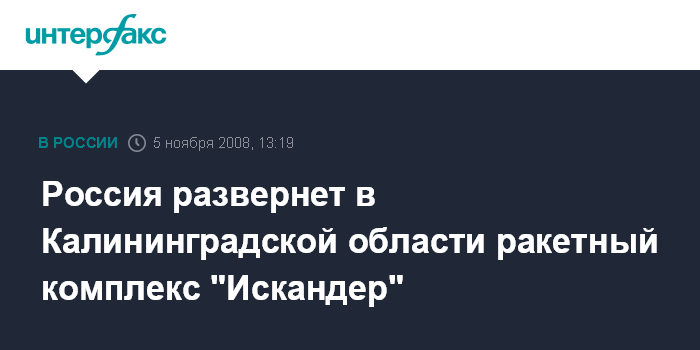Москва. 5 ноября. INTERFAX.RU - В связи с планами США по размещению элементов противоракетной обороны в Европе Россия развернет в Калининградской области комплекс "Искандер", сообщил президент РФ Дмитрий Медведев.