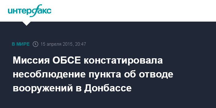 Москва. 15 апреля. INTERFAX.RU - В специальной мониторинговой миссии (СММ) ОБСЕ констатируют, что отвод тяжелого вооружения из зоны конфликта на Донбассе еще не завершен, а в окрестностях Донецка были слышны взрывы и выстрелы.