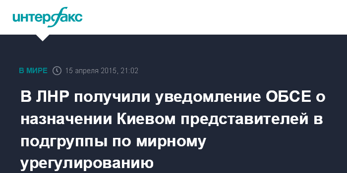 Москва. 15 апреля. INTERFAX.RU - В ЛНР заявляют, что получили уведомление от ОБСЕ о назначении Киевом представителей в подгруппы по отдельным вопросам мирного урегулирования.