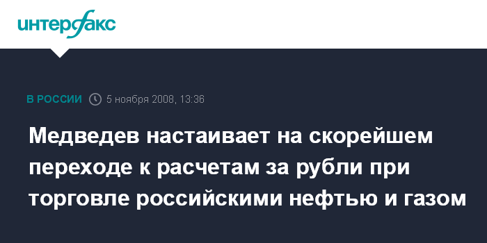 Москва. 5 ноября. INTERFAX.RU - Президент РФ Дмитрий Медведев заявил о необходимости ускорения работы по переходу к расчетам за рубли при торговле российскими нефтью и газом.